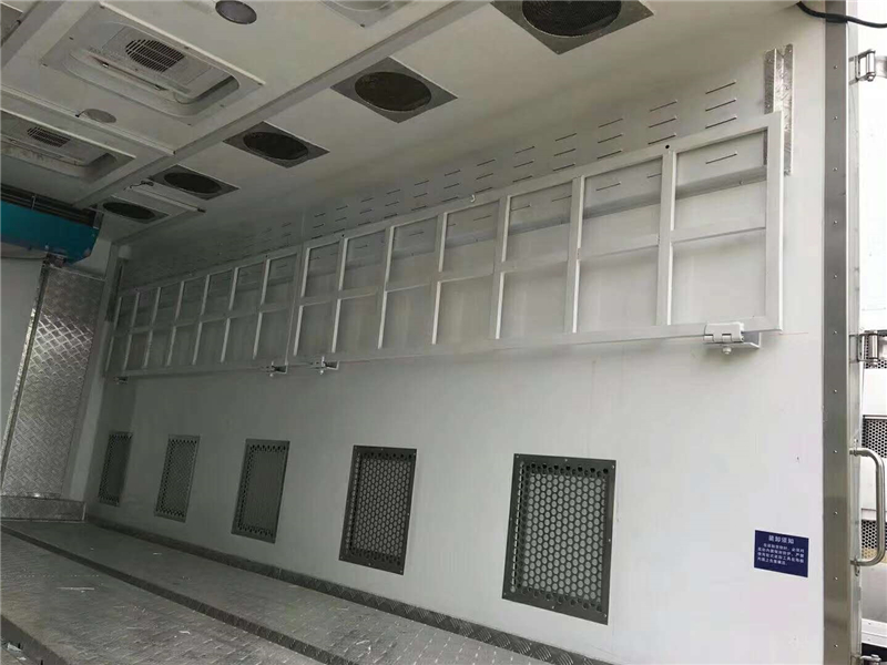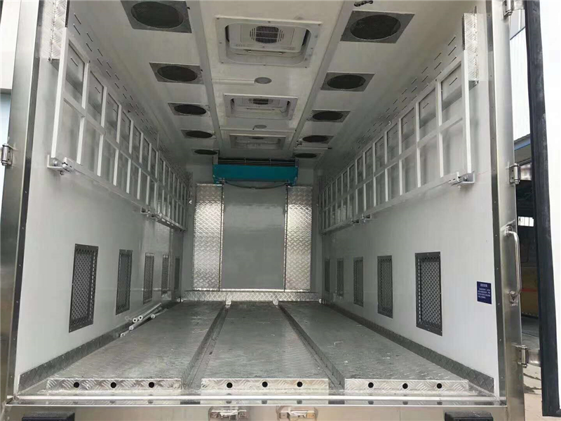 【豬苗車】上裝配置:外玻璃鋼,內(nèi)不銹鋼,兩層液壓升降層板,尾部液壓翻轉(zhuǎn)上豬平臺(tái),層板為不銹鋼骨架鋪鋁花紋板。外部電動(dòng)升降窗,排氣扇,柴油發(fā)電機(jī),暖風(fēng)加熱,喂水系統(tǒng),凈水箱、污水