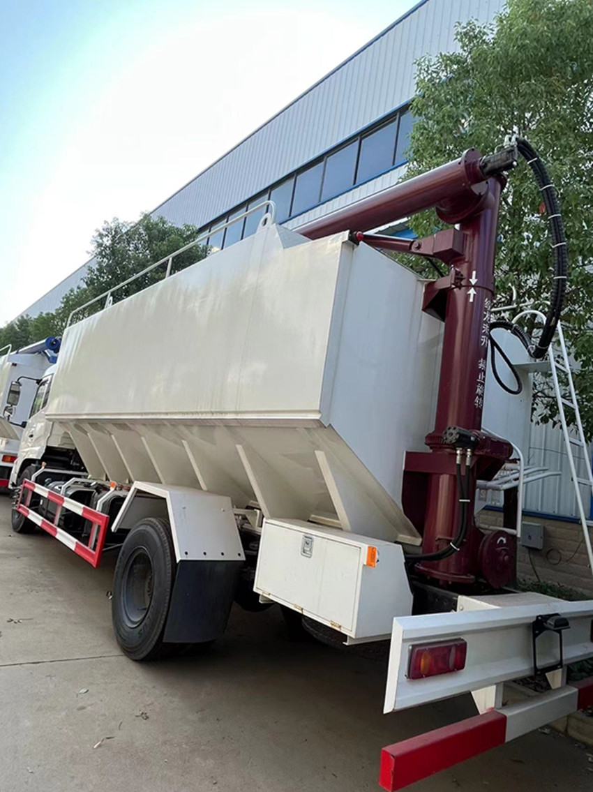 散裝飼料運(yùn)輸車,散裝飼料車的飼料罐架設(shè)在卡車的底盤上,罐頂開有進(jìn)料口.頂部的一根螺旋輸送卸料管(俗稱卸料絞龍)則可自由回轉(zhuǎn)和抬升,抬升的仰角可達(dá)60度。運(yùn)輸時,頂部的螺旋管平臥在罐頂;卸料時則抬起,使管端的出料口與畜禽飼養(yǎng)場貯料罐頂部的進(jìn)料門相接,駕駛室內(nèi)裝有操縱裝置(操縱裝置也可裝置在罐體尾部),卸料時通過車底的動力輸出軸和減速器來驅(qū)動螺旋,以完成卸料。