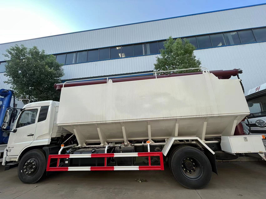 散裝飼料運輸車,散裝飼料車的飼料罐架設在卡車的底盤上,罐頂開有進料口.頂部的一根螺旋輸送卸料管(俗稱卸料絞龍)則可自由回轉和抬升,抬升的仰角可達60度。運輸時,頂部的螺旋管平臥在罐頂;卸料時則抬起,使管端的出料口與畜禽飼養(yǎng)場貯料罐頂部的進料門相接,駕駛室內裝有操縱裝置(操縱裝置也可裝置在罐體尾部),卸料時通過車底的動力輸出軸和減速器來驅動螺旋,以完成卸料。