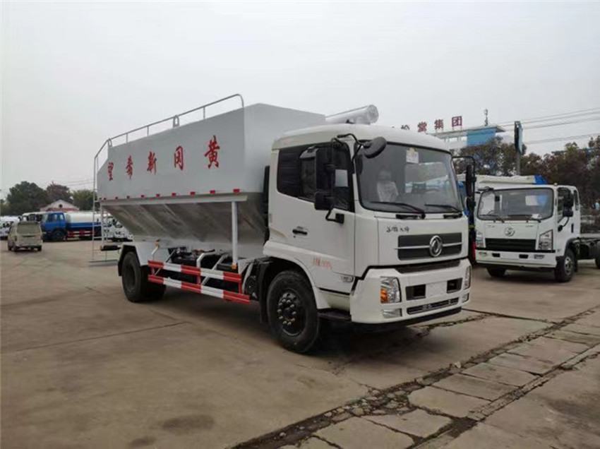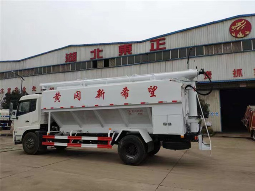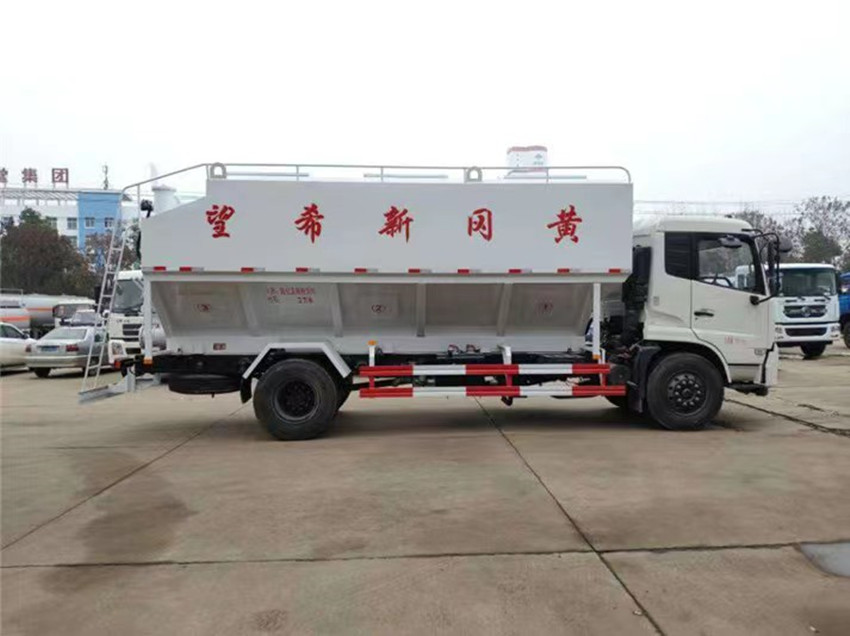 散裝飼料運(yùn)輸車,散裝飼料車的飼料罐架設(shè)在卡車的底盤上,罐頂開有進(jìn)料口.頂部的一根螺旋輸送卸料管(俗稱卸料絞龍)則可自由回轉(zhuǎn)和抬升,抬升的仰角可達(dá)60度。運(yùn)輸時(shí),頂部的螺旋管平臥在罐頂;卸料時(shí)則抬起,使管端的出料口與畜禽飼養(yǎng)場(chǎng)貯料罐頂部的進(jìn)料門相接,駕駛室內(nèi)裝有操縱裝置(操縱裝置也可裝置在罐體尾部),卸料時(shí)通過車底的動(dòng)力輸出軸和減速器來驅(qū)動(dòng)螺旋,以完成卸料。